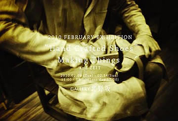[TITLE] 2010 FEBRUARY EXHIBITION "Hand Crafted Shoes" Making Things and ZEIT [DATE] 2010.02.09 (TUE) - 02.14 (SUN) [TIME] 11:00 - 18:00 (Last day 17:00) [PLACE] GALLERY Kitanozaka (Kobe) [EXHIBITION] Natsuko Hara / Eri Muraoka / kokochi / Shin Nakamura / Yusuke Omori / Tomohisa Sato / Gen Yoshida / Nobuyuki Uchio [SOUND] Jiro Hashimoto [PRESENTED BY] Making Things