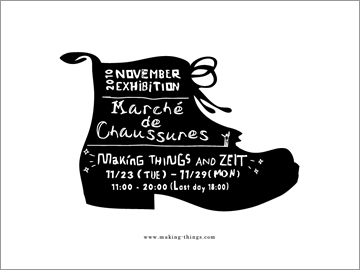 [タイトル] 2010 HAND MADE SHOES NOVEMBER EXHIBITION "March'e de Chaussures" Making Things and ZEIT [日時] 2010年11月23日(火)- 11月29日(月)11:00 - 20:00(初日13:00 - / 最終日 - 18:00) [会場] BAL gallery 33 (KOBE BAL 6F) http://www.bal-bldg.com/kobe/3007/ [展示作家] 内尾 暢志 / 大上 勉 / オオモリユウスケ / kokochi / 佐藤 智久 / 田中 康雄 / 中沼 朋子 / ハラナツコ / 松村 大樹 / 村岡映里 / SHOE&SEWN / 安田 法由 / 山口 祥弘 / 吉田 原 [ワークショップ] kokochi [サウンド] 橋本 次郎(ZEIT) [主催] Making Things [URL] http://bit.ly/bChTug