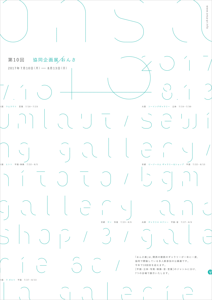 [タイトル] 第10回 協同企画展 おんさ [日時] 2017年7月10日(月)- 8月13日(日) [ジャンル] 平面 / 立体 / 写真 / 映像 / 音 / 言葉 [会場] UMLAUT / SEWING GALLERY / hitoto / bgm gallery and shop / 3 / galerie 6c / la galerie [URL] Facebook