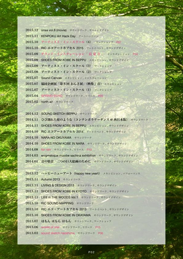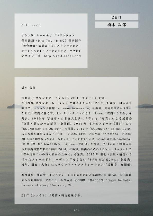 [タイトル] ポートフォリオ [P01] ツァイト / 橋本 次郎 [P02] 2015 / 2014 / 2013 [P03] 2012 / 2011 / 2010 / 2009 [P04] サウンド・インスタレーション「 長 覚 寺 」 [P05] SPRING ECHO [P06] サウンドスケッチ・直島 [P07] アーティスト・イン・スクール [P08] サウンド・エキシビション 2012 "リヒト" [P09] 空間 × 散らかった部屋 [P10] for rain / ホシノコトバ [P11] music for bota / 森の音 [P12] GARDEN / ORBIS