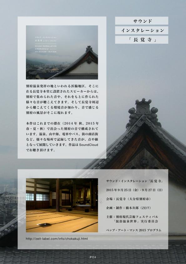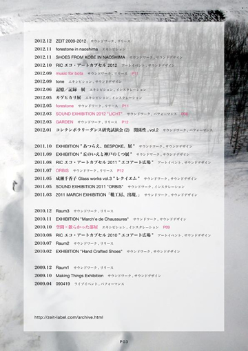 [TITLE] PORTFOLIO [P01] ZEIT / Jiro Hashimoto [P02] 2015 / 2014 / 2013 [P03] 2012 / 2011 / 2010 / 2009 [P04] SOUND INSTALLATION "CHOKAKUJI" [P05] SPRING ECHO [P06] sound sketch naoshima [P07] ARTIST IN SCHOOL [P08] SOUND EXHIBITION 2012 "LICHT" [P09] Raum × The Messy Room [P10] for rain / words of star [P11] music for bota / forestone [P12] GARDEN / ORBIS